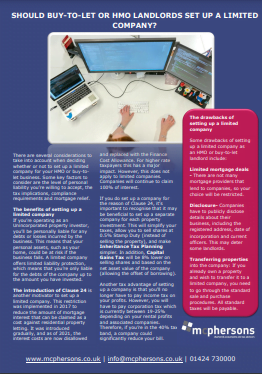 Are you a buy-to-let or HMO landlord? Have you considered whether setting up a limited company might reduce your tax burden? The answer depends on a number of factors so we have put together a short guide of the pros and cons here. Our tax team are experts at advising landlords so please get in touch with any questions and we can advise you. info@mcphersons.co.uk or 01424 730000.